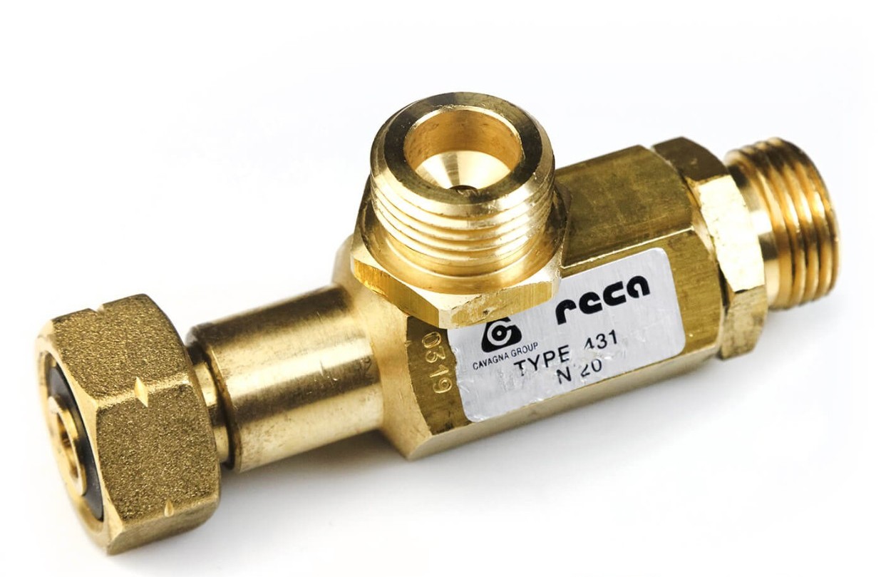 Тройник предназначен для соединения баллонов между собой и объединения их в группы. Тройник оборудован скоростным клапаном, который перекрывает поток газа в случае обрыва шланга.